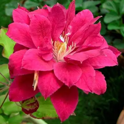 Крупноцветковый клематис Ред Стар – это многолетняя листопадная лиана. Длинные, 2-метровые побеги покрыты сочной изумрудной листвой. 2 раза в год на растении появляются крупные цветы размером до 15 см. Широкие лепестки окрашены в светло-алый цвет с малиновым отливом. Декоративность цветку предает бледно-розовая полоска, проходящая ровно по центру каждого лепестка.
