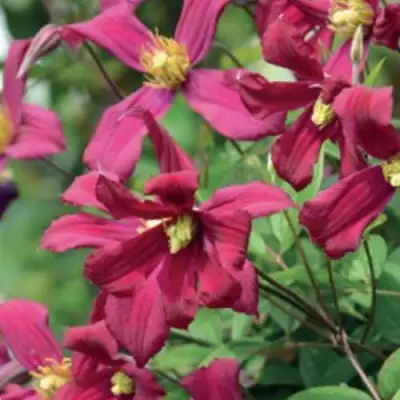 Цветки данного клематиса имеют пленительную карминовую окраску и достигают в диаметре 10-13 см. Их бархатистая текстура и яркие желтые пыльники создают эффектный контраст, который привлечет внимание каждого, кто увидит растение. Каждый цветок состоит из 5-6 эллиптических, своеобразно скрученных чашелистиков, что придает ему уникальность и очарование.