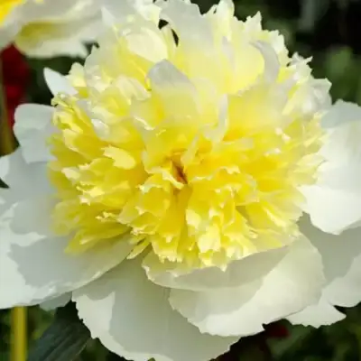 Особенное внимание заслуживают цветы 'Ханни Голд'. Средний по размеру цветок с диаметром около 17 см имеет сложное строение, сочетая махровые, японские и корончатые элементы. Внешние лепестки округлые, бело-кремовые, а внутренние — золотисто-желтые, рассеченные, что создаёт уникальный двухцветный контраст. Яркие и насыщенные цвета этого пиона создают бомбовидную форму, которая завораживает своим великолепием. Приятный и нежный аромат цветов станет дополнительным бонусом для вашего сада.