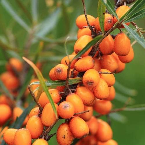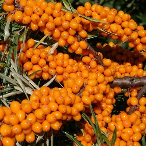 Ягоды облепихи крепко сидят на ветке, образуя скопление ярко-оранжевого цвета. Плод овальный, весом от 0,8 до 0,9 грамм. Мякоть ягод мясистая и сладкая на вкус, а по дегустационным оценкам экспертов это единственный сорт, который получил 5 из 5 баллов.