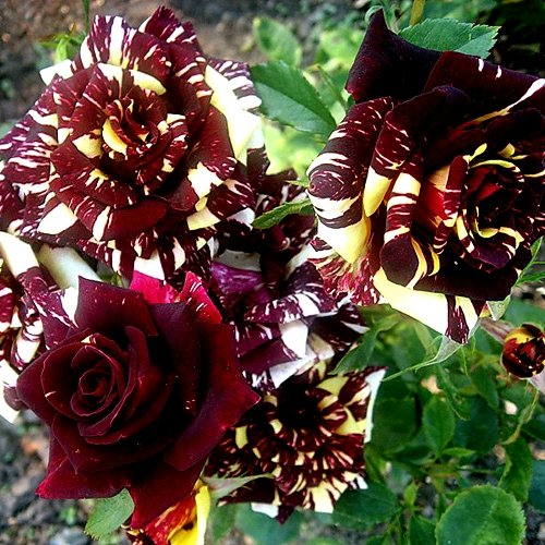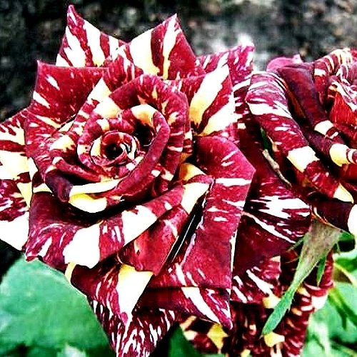 Окраска бутона этой розы яркая и привлекательная - темно-красная с оранжево-желтыми штрихами и полосами. Цветок сам по себе также имеет темно-красную окраску с оранжево-кремовыми и желтыми штрихами и полосами. Основная окраска цветка - красная.