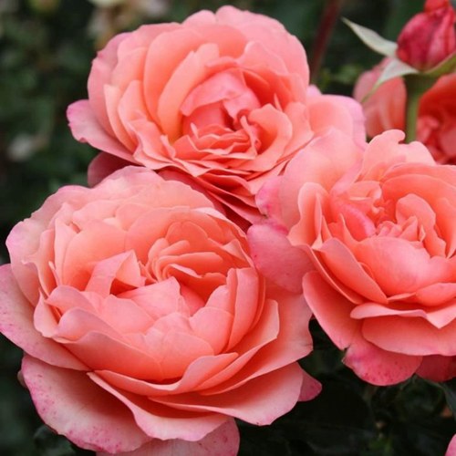 Основной акцент в этом сорте — его цветок. Бутоны округлой формы раскрываются в элегантные чашевидные цветки диаметром 7–8 см. Их окраска уникальна: сочетание абрикосово-лососевых и розовых тонов с лёгкой розовой каймой по краю лепестков создаёт мягкий, но яркий визуальный образ. Цветы умеренно махровые (17–25 лепестков), с пышным, насыщенным центром и изящной формой, которая долго сохраняется в жару и после дождя. Аромат — нежный, с выраженными фруктовыми нотами. Он достаточно сильный, чтобы быть заметным, но не резкий, благодаря чему сорт идеально подходит для посадки вблизи зон отдыха.