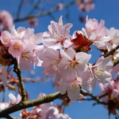 Саженцы вишни декоративной Ранчо Саржента радуют прекрасными цветами в мае. Их лепестки варьируются от нежно-розовых до беловато-розовых с лёгким волнистым краем, а соцветия по 2-3 цветка создают настоящую церемонию красоты в вашем саду.